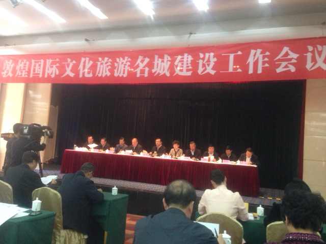 敦煌国际文化旅游名城建设工作会议于2014年4月11日在酒泉宾馆召开,参加会议的领导有省委常委连辑部长、省人大李慧副主任、副省长张广智、省政协副主席栗震亚、省委宣传部常务副部长张建昌、酒泉市委书记马光明、市长都伟、省直有关厅局级领导、各地州市常委宣传部长、酒泉市、敦煌市各级领导、文化产业企业、新闻媒体等近200人参加了会议。会议由张广智副省长主持,宣读了省政府办公厅《关于印发敦煌国际文化旅游名城建设重点任务分解的通知》;张建昌常务副部长简要介绍《敦煌国际文化旅游名城建设发展规划纲要》;酒泉市委常委、敦煌市委书记詹顺舟介绍敦煌国际文化旅游名城建设近期进展情况;省发改委、省住建厅、省国土资源厅、省文化厅进行了表态发言。这次企业代表只有中国文化传媒集团、南特数码科技集团,南总作为我省本土唯一文化企业代表在大会上进行了发言。(见南总:《为敦煌国际文化旅游名城建设添砖加瓦》)在参会领导和代表中引起了较好的反响,敦煌研究院负责人发言,酒泉市委书记马光明发言。