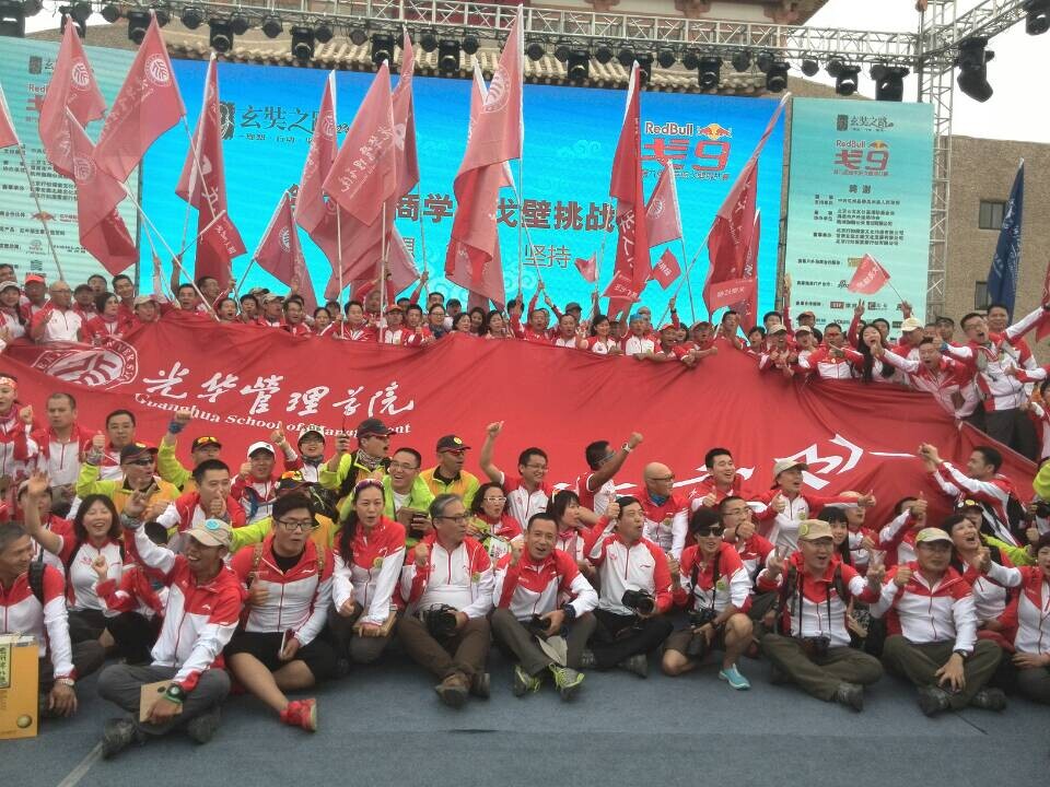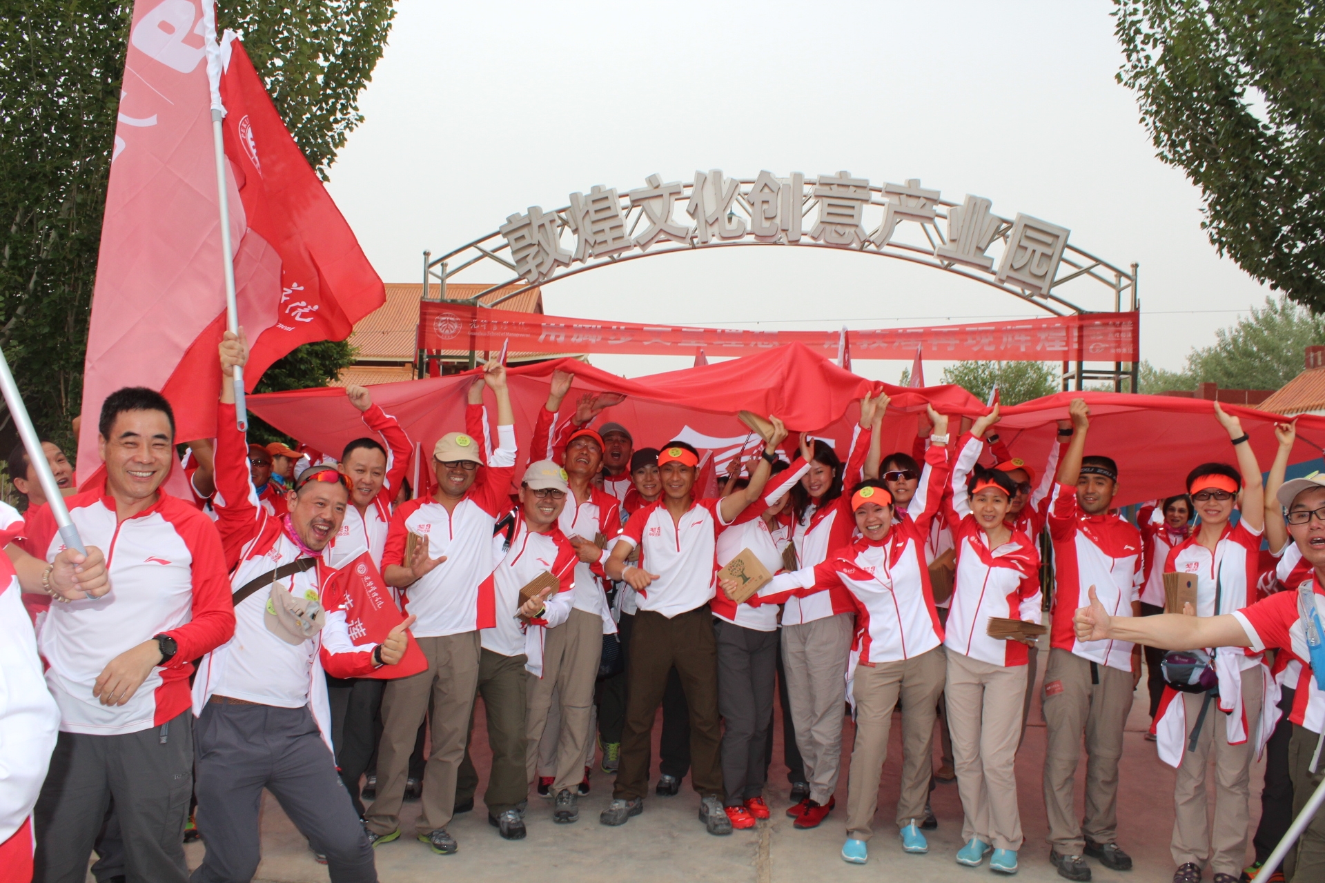 5月21日,第九届玄奘之路戈壁徒步挑战赛在敦煌正式拉开帷幕,敦煌文化产业创意园也在今日再一次沸腾了。下午6点左右敦煌文化产业创意园全体员工站在门口迎接来自北大光华管理学院的一百多名“戈九”健儿们,他们手举“戈9光华之队”的大旗在这里欢呼,在这里高声呐喊“北大光华,光耀中华”、“戈九戈九,天长地久”。