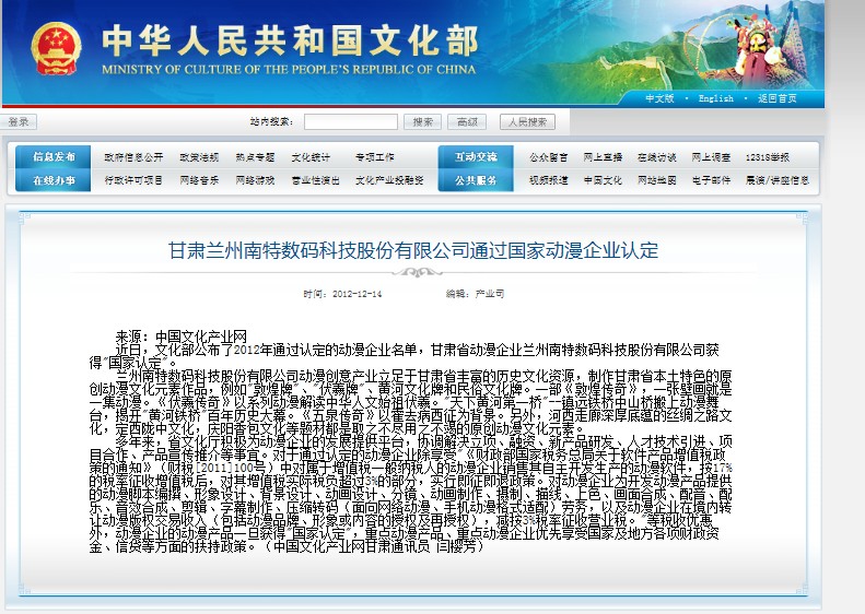 甘肃兰州南特数码科技股份有限公司通过国家动漫企业认定