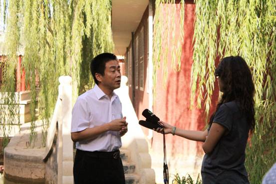 在园区工作人员的陪同下,詹顺舟书记进入园区接受了甘肃卫视和酒泉电视台记者的采访,采访中詹书记对敦煌文化创意产业园给予了极大的期望,希望通过政府出台优惠政策。园区搭建优良平台,媒体多做广泛的宣传,借助现代科技手段这个平台大力弘扬敦煌文化。